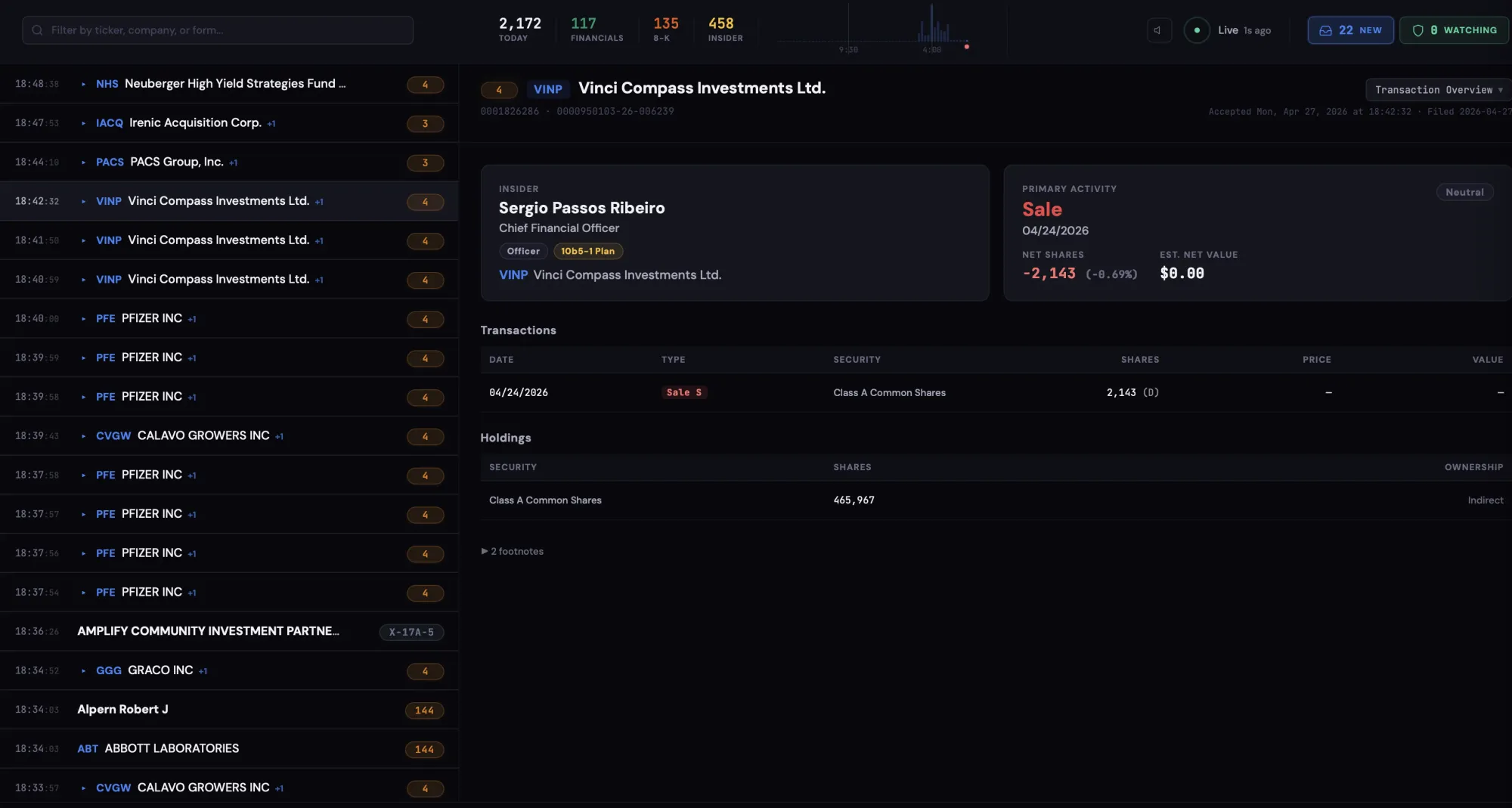 The centerpiece is the live feed of SEC filings. It behaves pretty much the same as in the previous version of the app - filing stream in as they land on the SEC but you can now filter and search back through months of filings and the UI behaves snappily.
