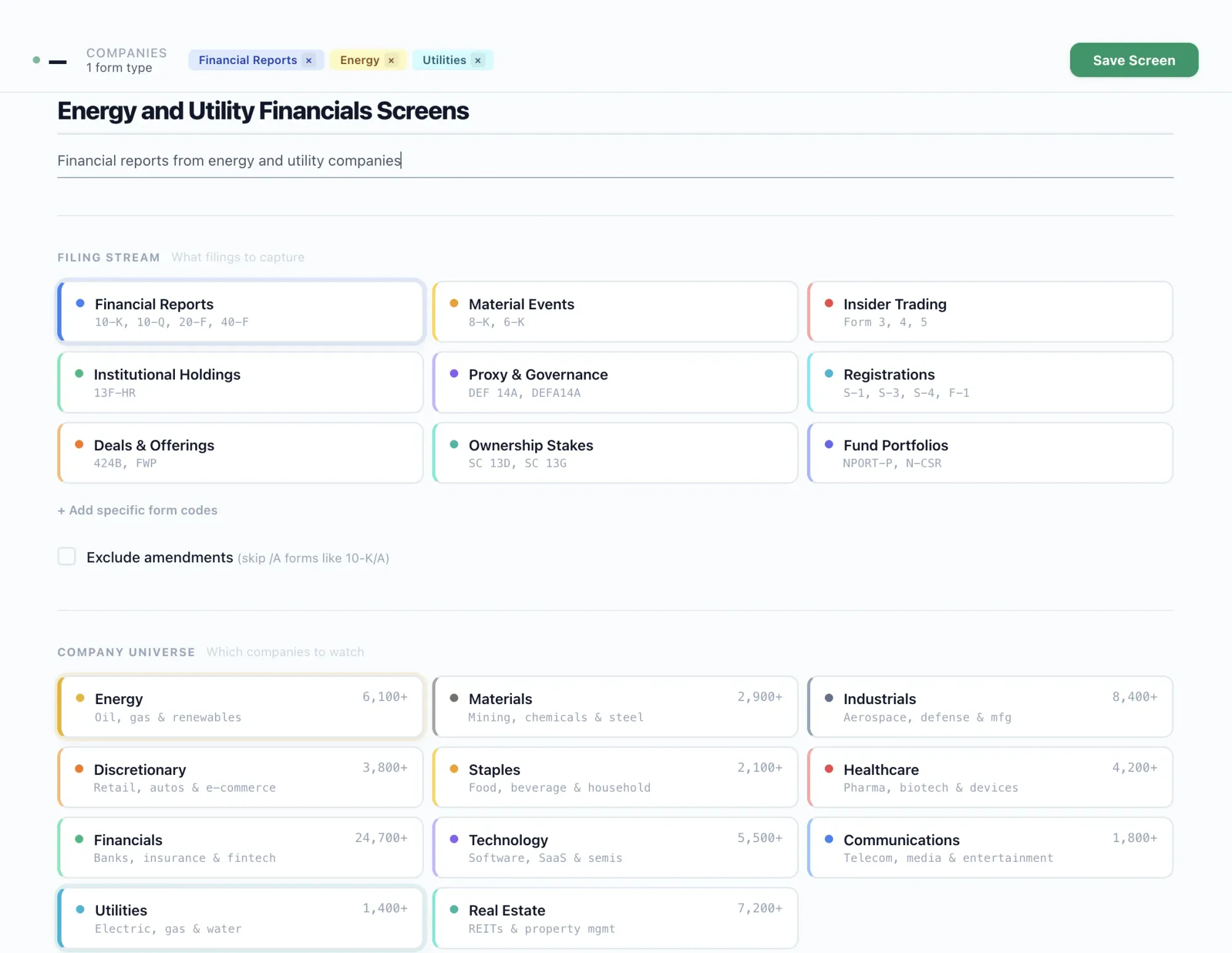 The app is built on the entire SEC universe. Screens allow you to see only what you want. And you can use Screens with Sentinels.
