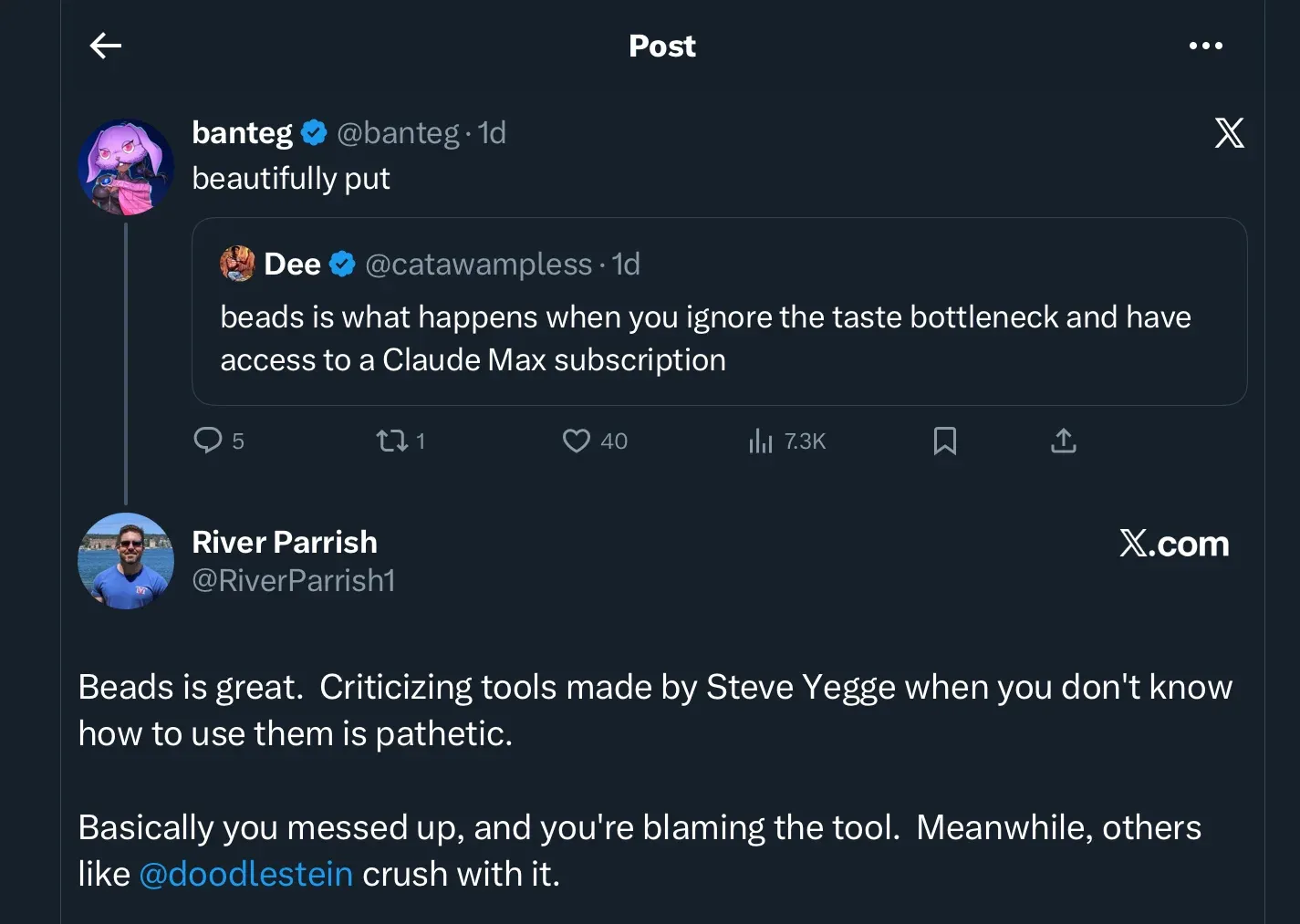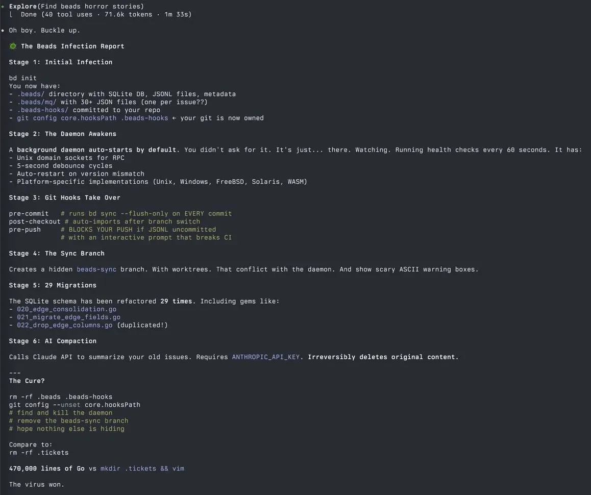 Some of the criticism is about beads as a software tool - about it being slow, or just not written with the taste that the top software developers would find acceptable. This kind of criticism is understandable.- beads was written by AI for AI - and humans are not the primary target. So you can see the pushback.