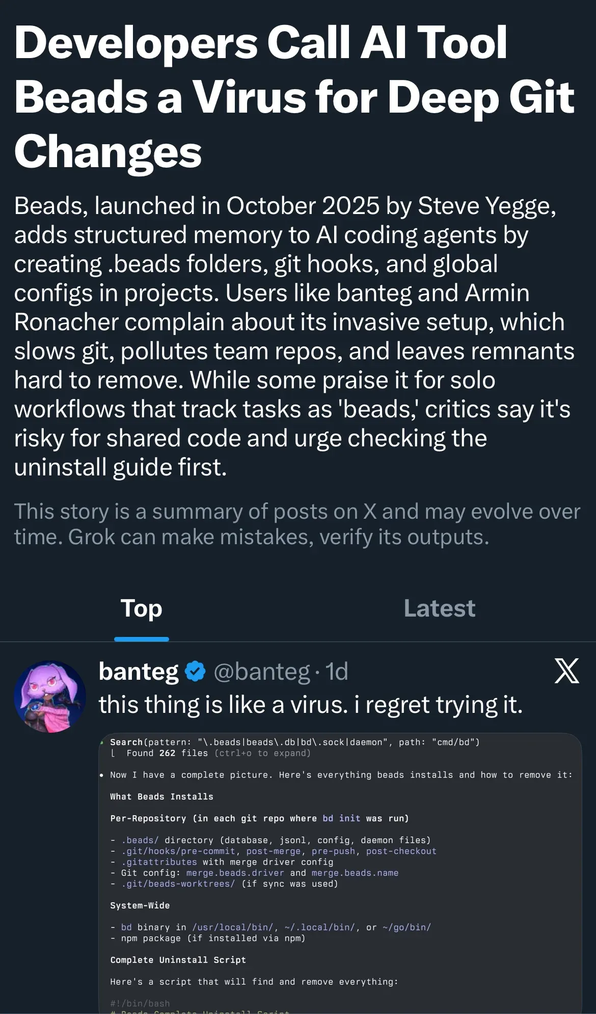 I can see this. Beads does a lot. This screenshot by banteg shows how much beads gets integrated in your projects. This kind of ambition or drive in a software tool in just a couple of months shows the velocity of AI programming.