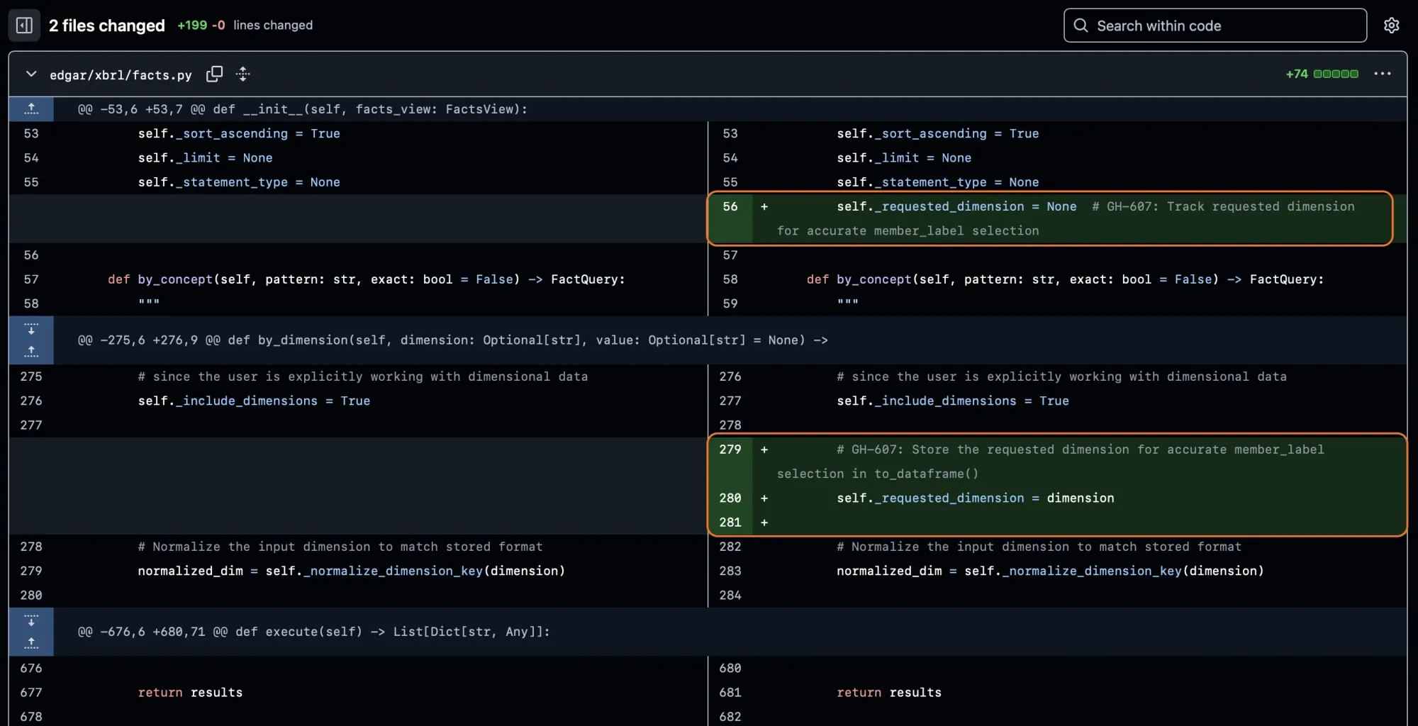 The bug was an issue where the wrong labels were returned when querying XBRL facts by dimension. I had attempted a fix and released it, but the bug was reopened since it wasn't quite correct. Within hours of the reopened issue a fix appeared from a contributor I didn't recognize.