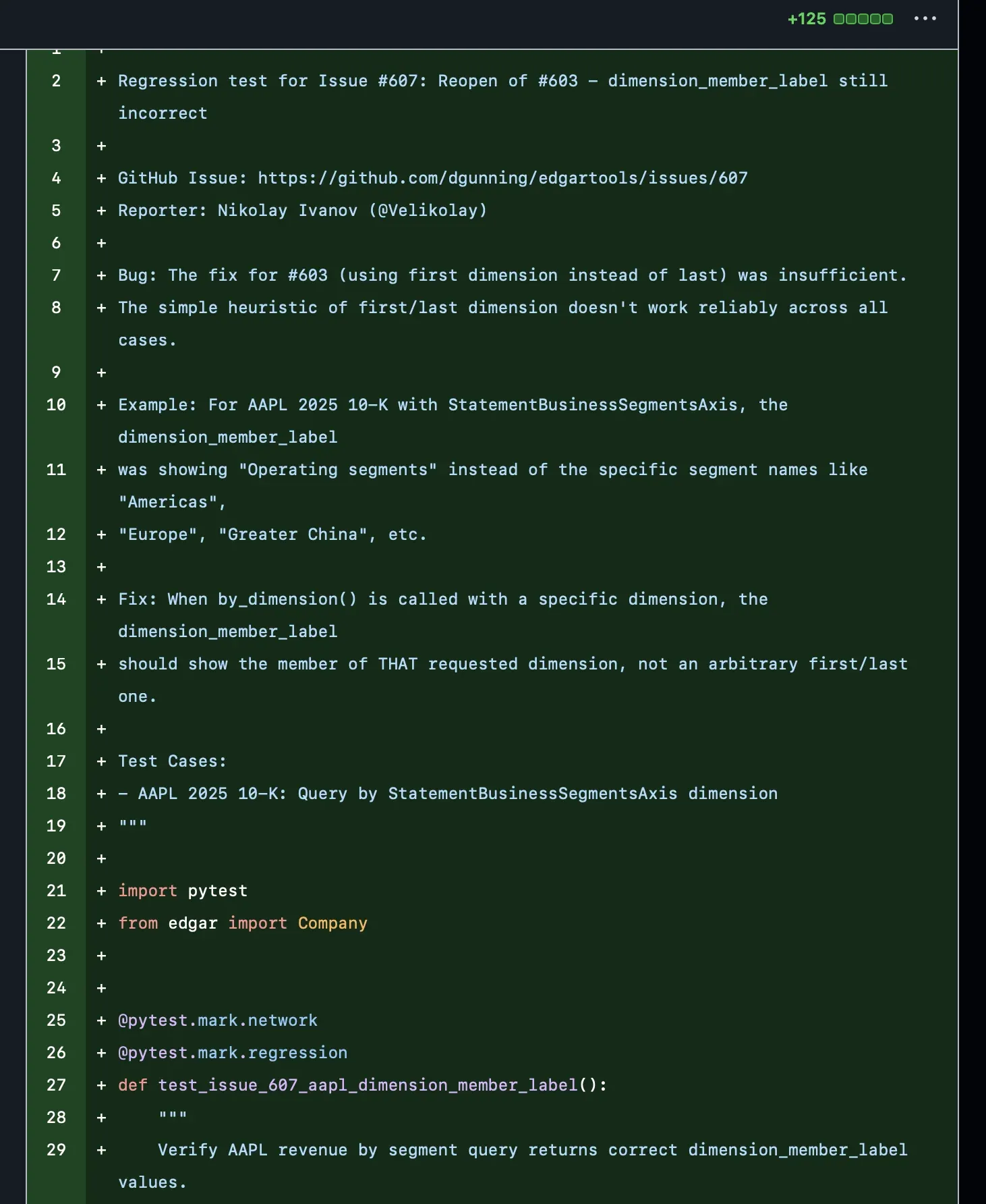 The PR also included a 125 line regression test. But look at the comments on the test class - it referenced the Github issue and described the bug and the fix. Impressively it showed some understanding of the business logic behind dimension labels like "Americas", "Europe", "Greater China" and in fact it was this understanding why it was able to apply the correct fix.