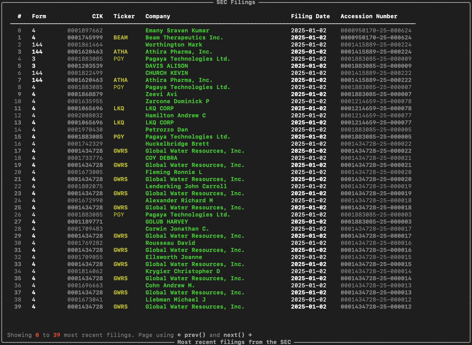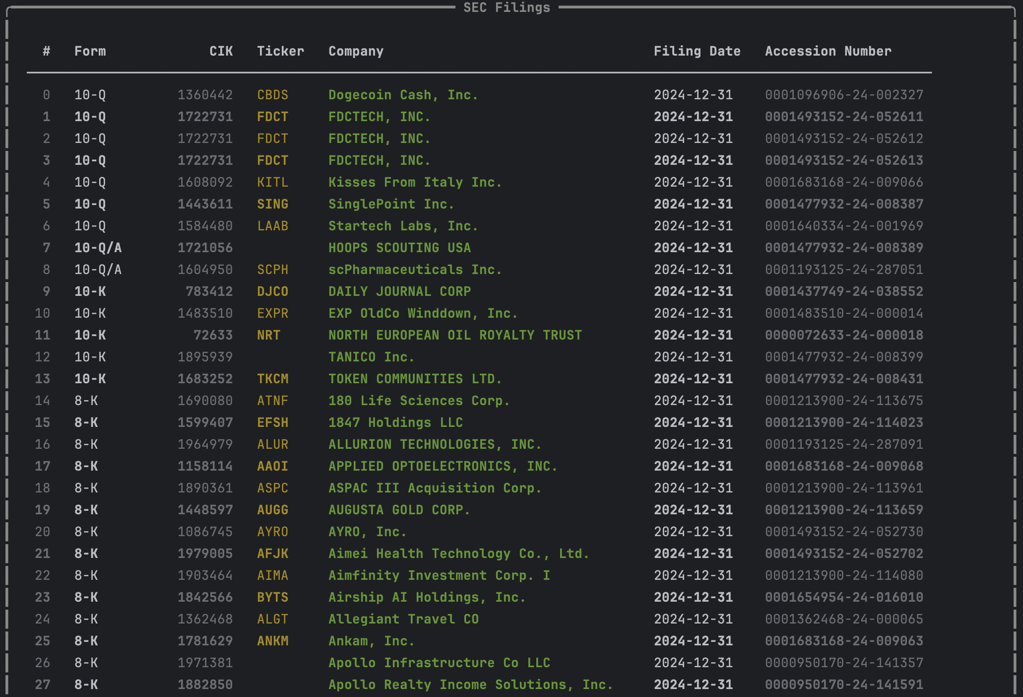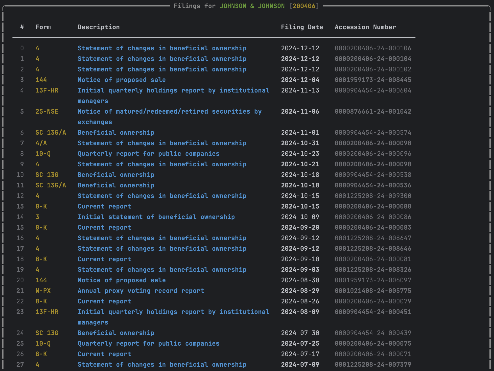 Small interesting caveat, I'm writing this as we speak on January 2nd 2025, and get_filings returns no filings. This reminds me that get_filings() by default returns the filings for a given year and quarter, and there are no filings as of yet in 2025. So the filings displayed in the image above are with get_filings(year=2024) . This also reminds me that the bug that used to happen at the beginning of a quarter when there is no data is finally fixed! Nice!