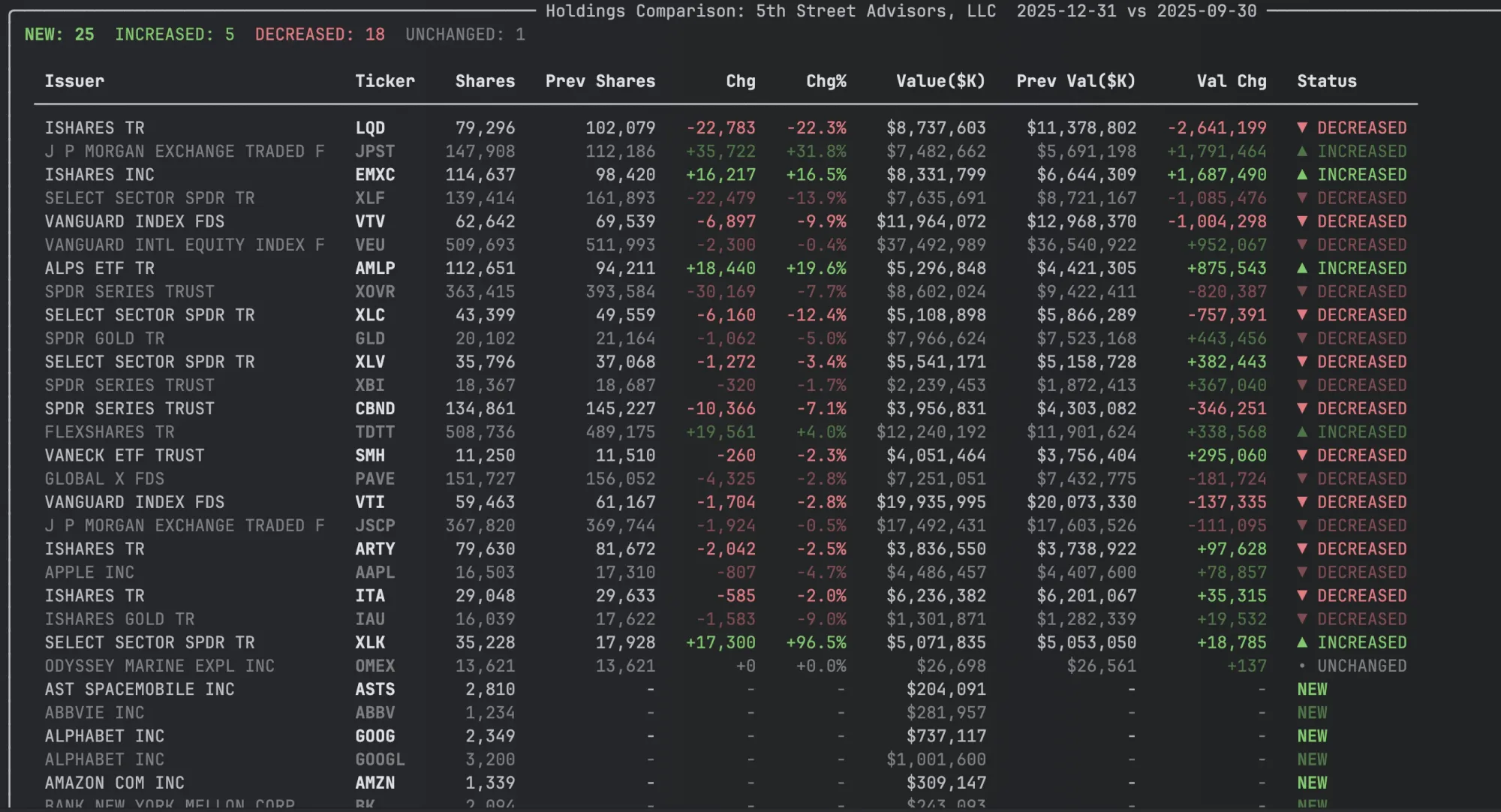 I also added a second view - HoldingComparison that has several columns showing changes over the previous quarter. You can get it by calling compare_holdings() on a ThirteenF object.