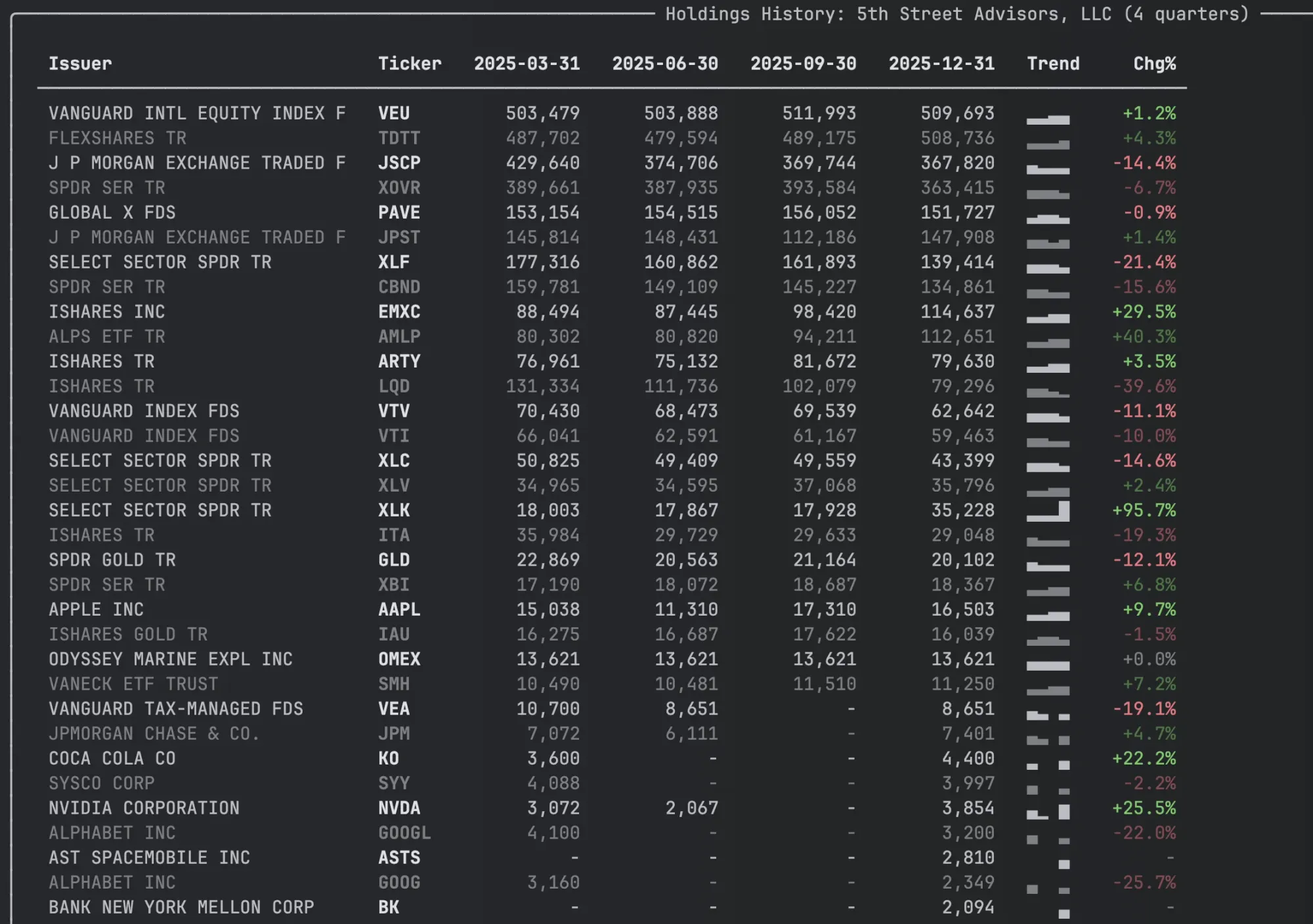 So I spent an afternoon coding the changes in the ThirteenF class. I added a HoldingsView class that retrieves multiple previous filings and renders like below in the terminal with the trend sparkline I was interested in. You get it by calling holdings_view on the ThirteenF