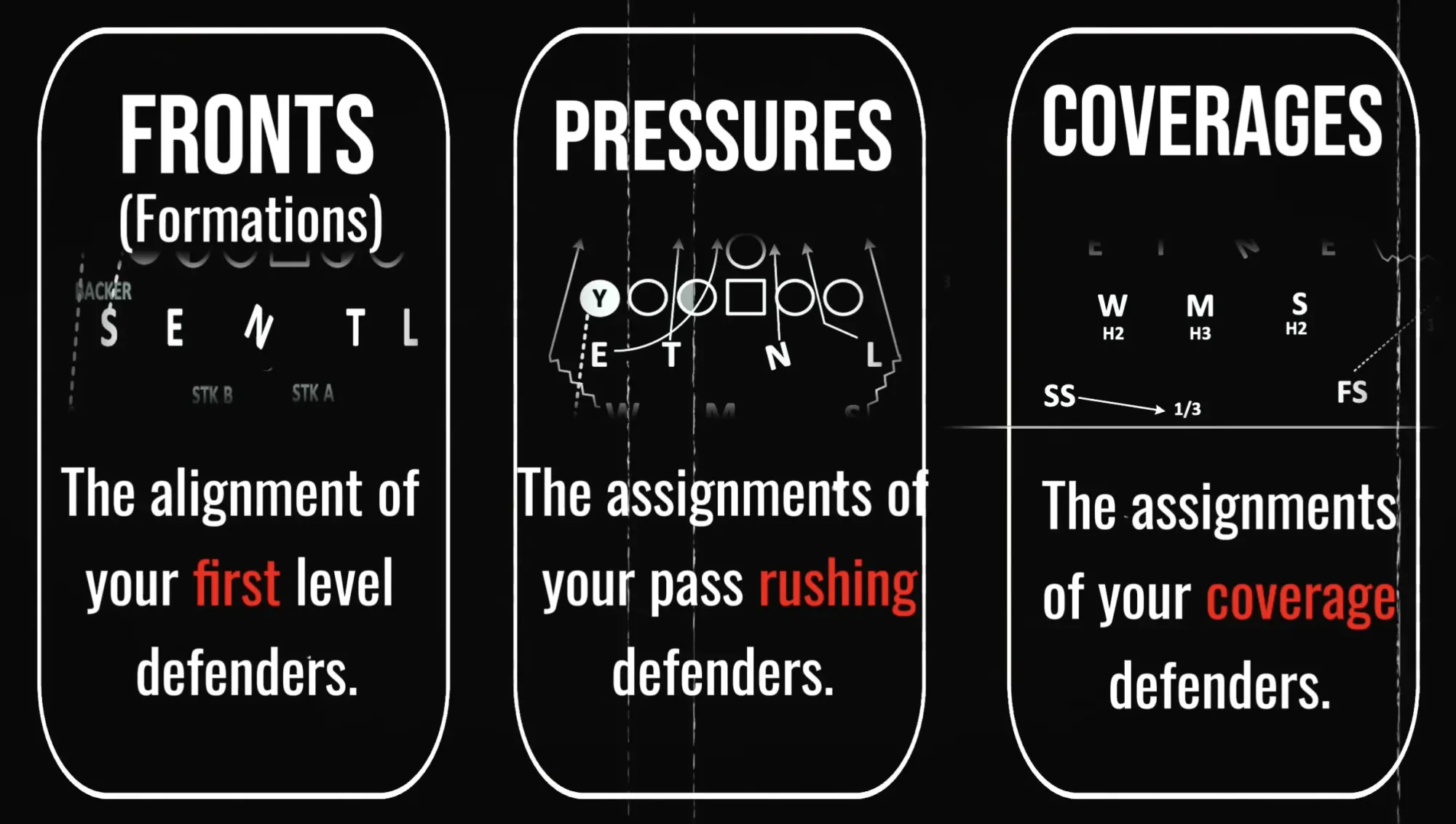 Macdonald's system breaks a defensive play into three independent modules. Fronts are the formation — where your linemen line up at the point of attack. Pressures are the rush assignments — who attacks the quarterback, from where, and who fakes the rush and drops into coverage instead. Coverages are the assignments behind the rush — who protects what space downfield.