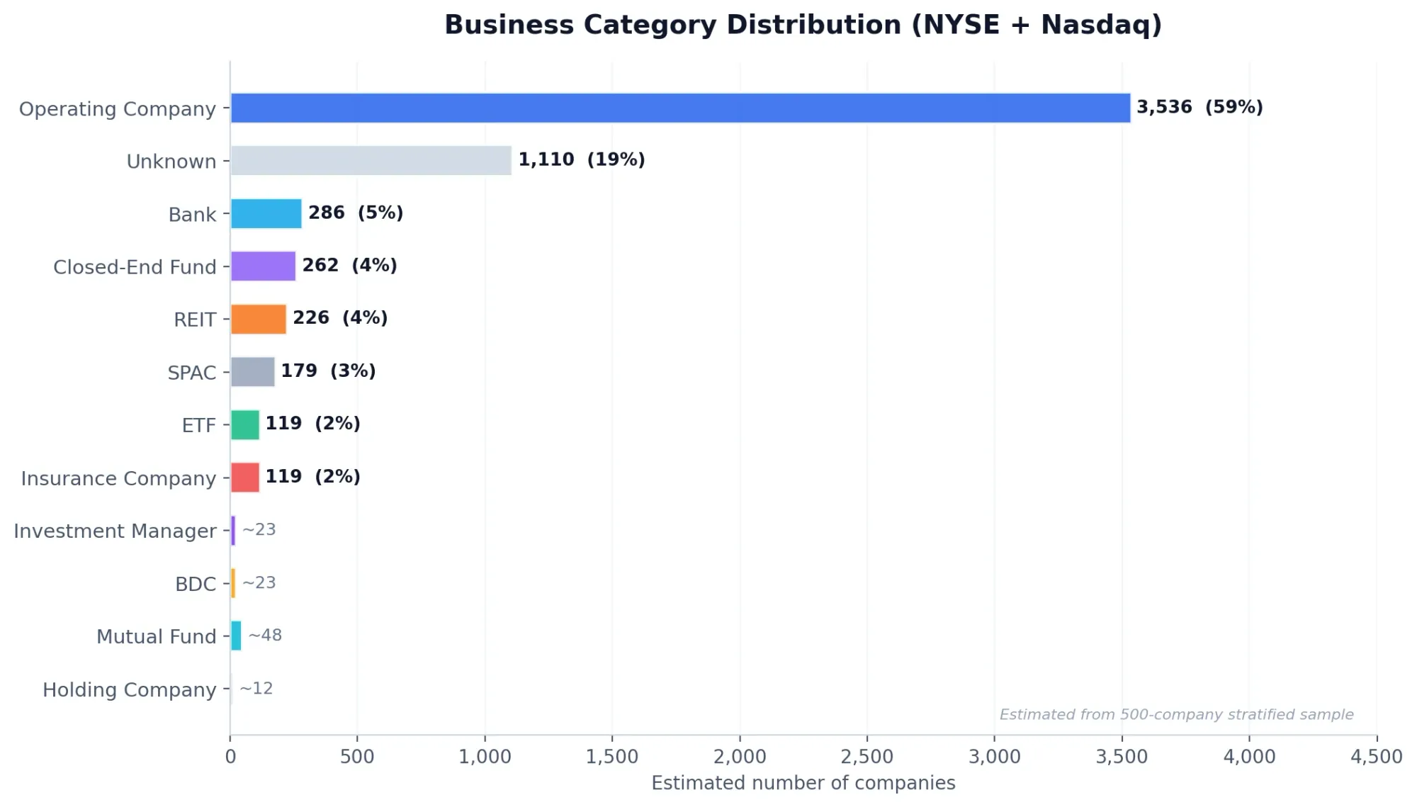 Even within those ~8,000 companies with tickers, you can't treat them all the same. The SEC assigns every entity a type (operating, investment, or other), but it's not much help for classification. A quarter of listed companies end up as "other," including real pharma and software companies. And a quarter of what the SEC calls "operating" is actually asset-backed securities vehicles. The labels were never designed for analytical use.